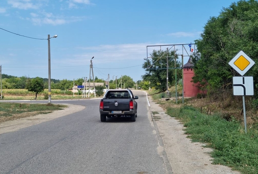 Перекрёсток, остановка. Направление в центр населенного пункта, школа, Примэрия